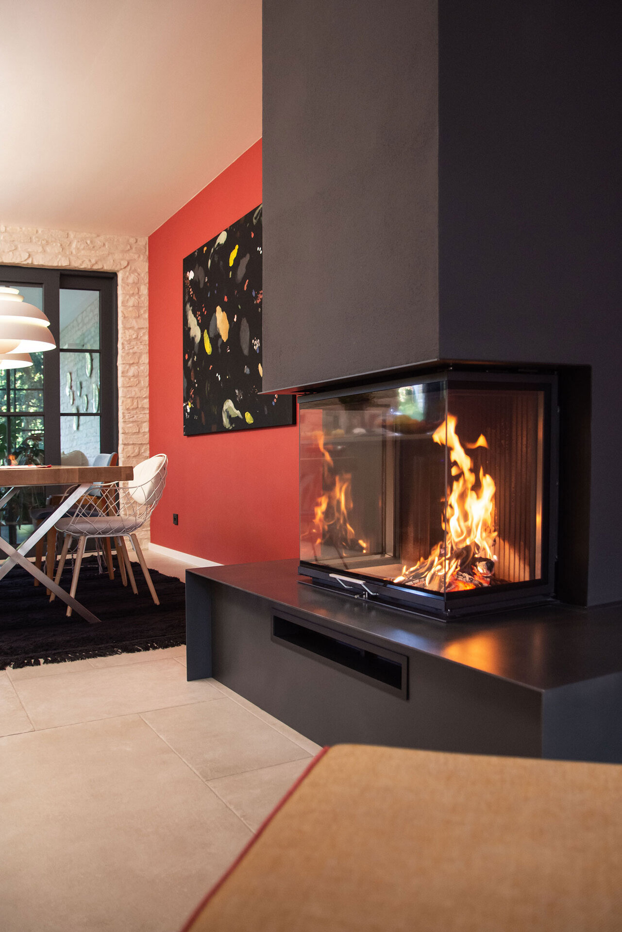 Otvorené dvierka sú vysunuté v komore nad krbovou vložkou a nezasahujú tak do obytného priestoru. Precízny chod dvierok vo vysokých prevádzkových teplotách zaručuje osem ložísk, odolných voči teplotám do 350 ° C. Pohyb ložísk presne a trvalo vymedzujú nerezové lišty, pripevnené na korpuse krbovej vložky. Pri otváraní dvierok dôjde najprv k ich miernemu odtiahnutiu od korpusu, aby sa zabránilo poškodeniu dverného tesnenia trením. Pri otváraní sa dvierka posúvajú nahor vo vzdialenosti niekoľkých milimetrov od krbovej vložky. Dokonalé utesnenie ohniska pri uzavretých dvierkach je zabezpečené pružinovým mechanizmom, ktorý v spodnej polohe pritláča dvierka ku korpusu silou 250 N.